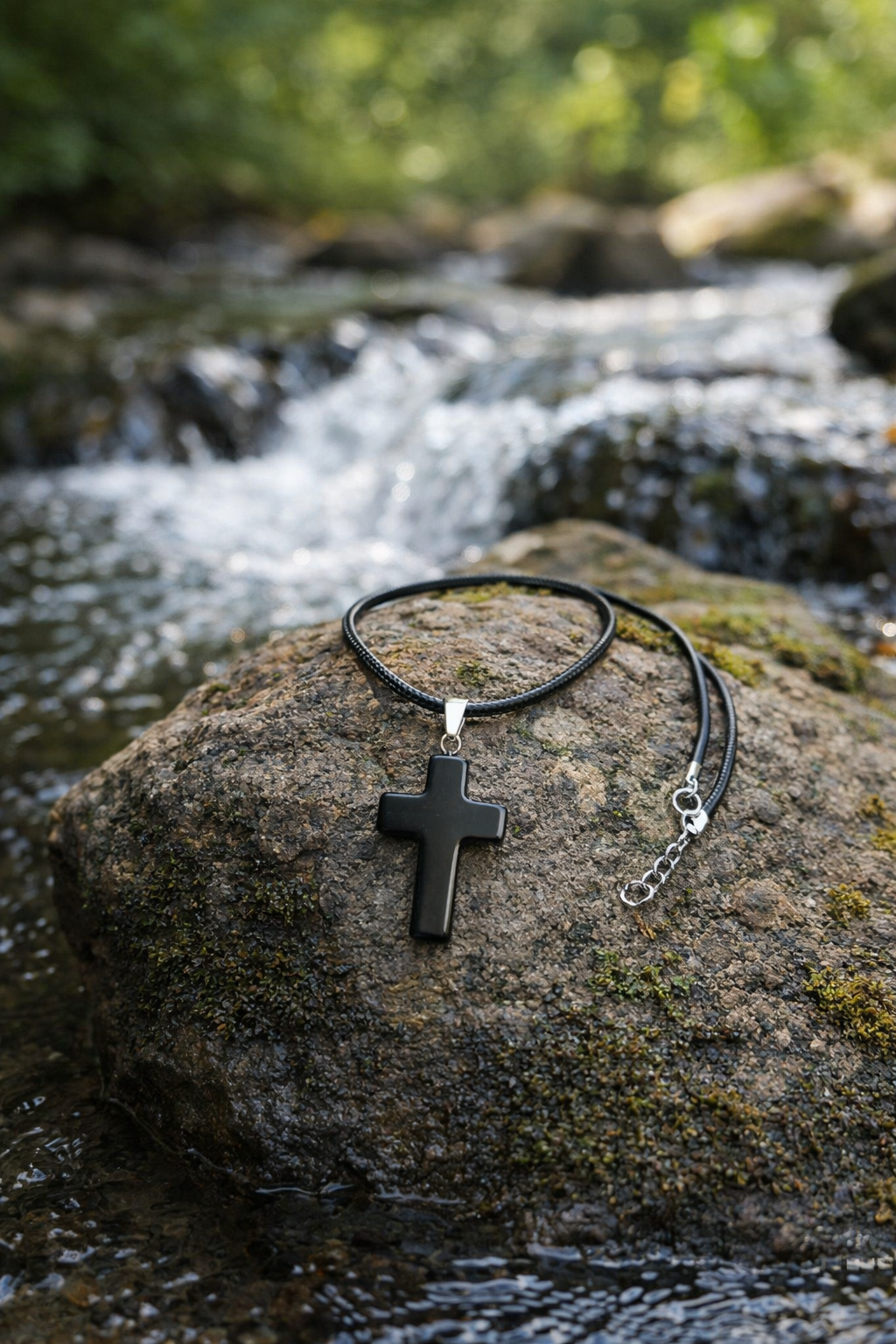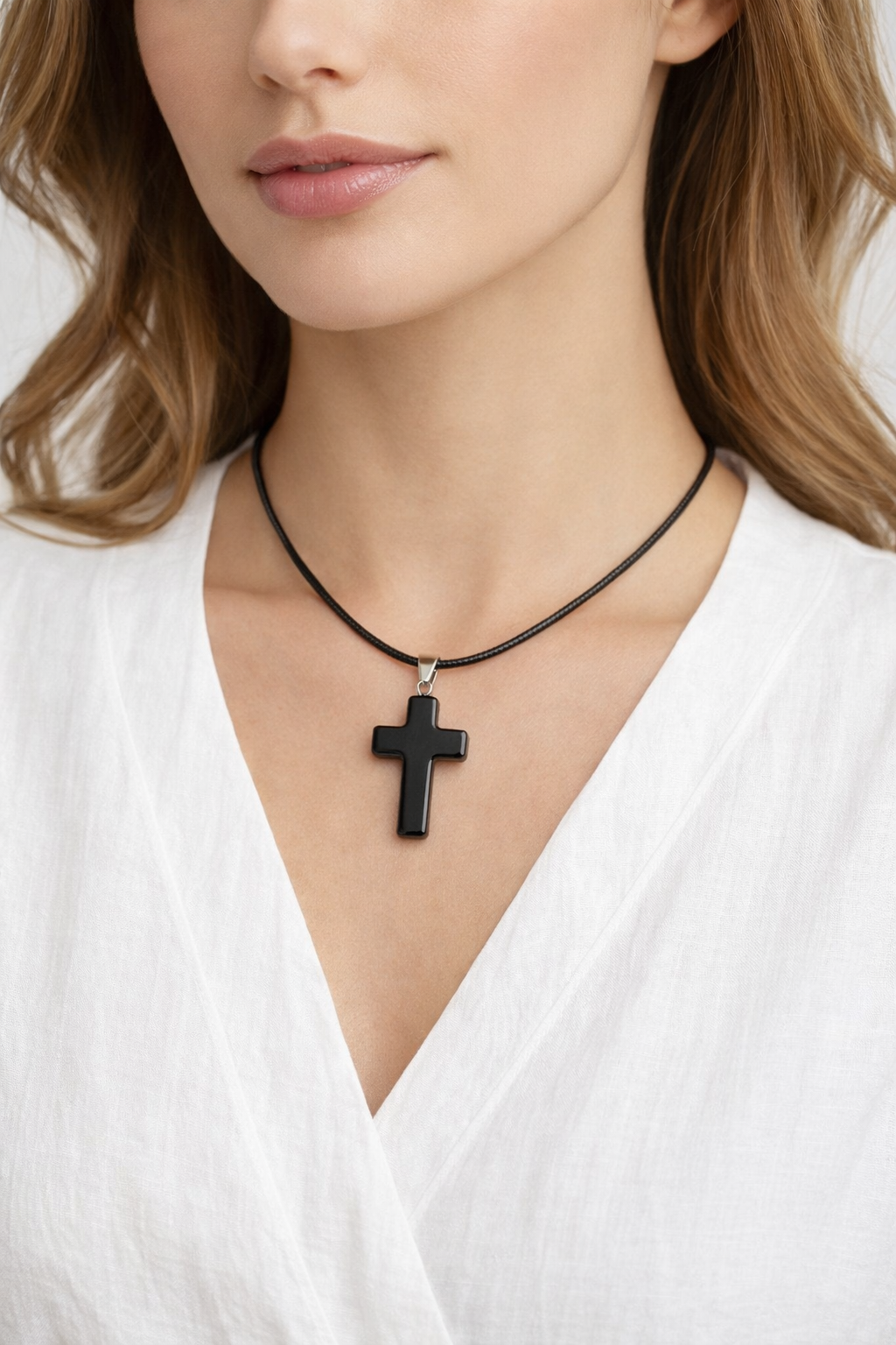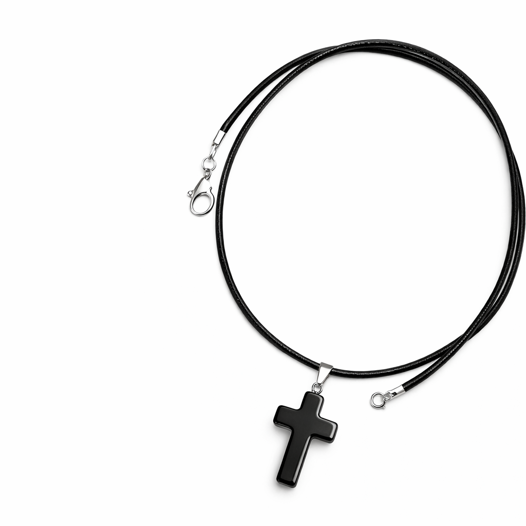 This elegant necklace features a polished black onyx cross pendant, suspended on a sleek black leather cord, creating a powerful yet minimalist statement piece. Designed to be unisex, this necklace blends spiritual symbolism with modern style, perfect for everyday wear or meaningful gifting.