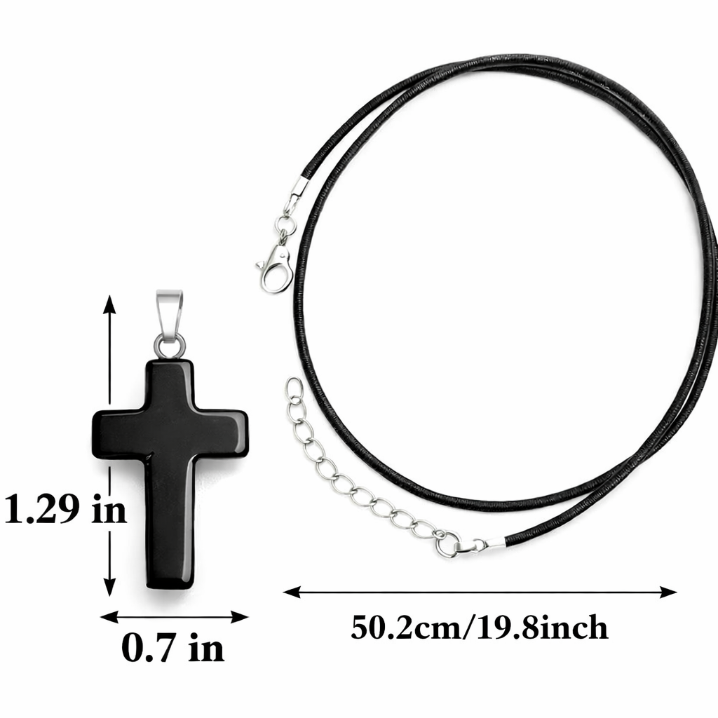 📏 Size & Details • Cross pendant: • Height: 3.3 cm / 1.29 inches • Width: 1.8 cm / 0.7 inches • Necklace length: 50.2 cm / 19.8 inches • Cord thickness: approx. 2 mm • Material: Black leather cord, polished onyx cross • Closure: Lobster clasp with adjustable extender