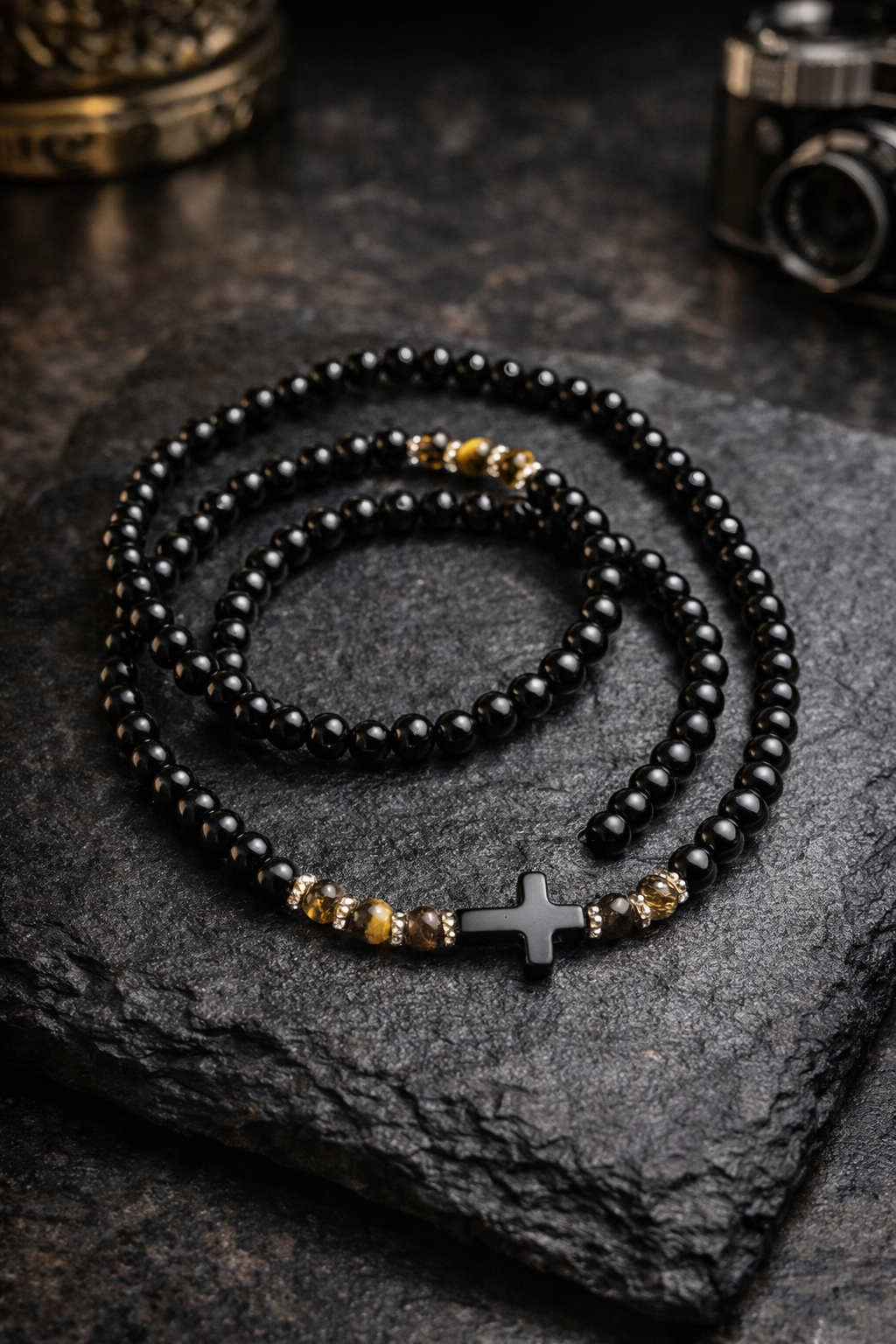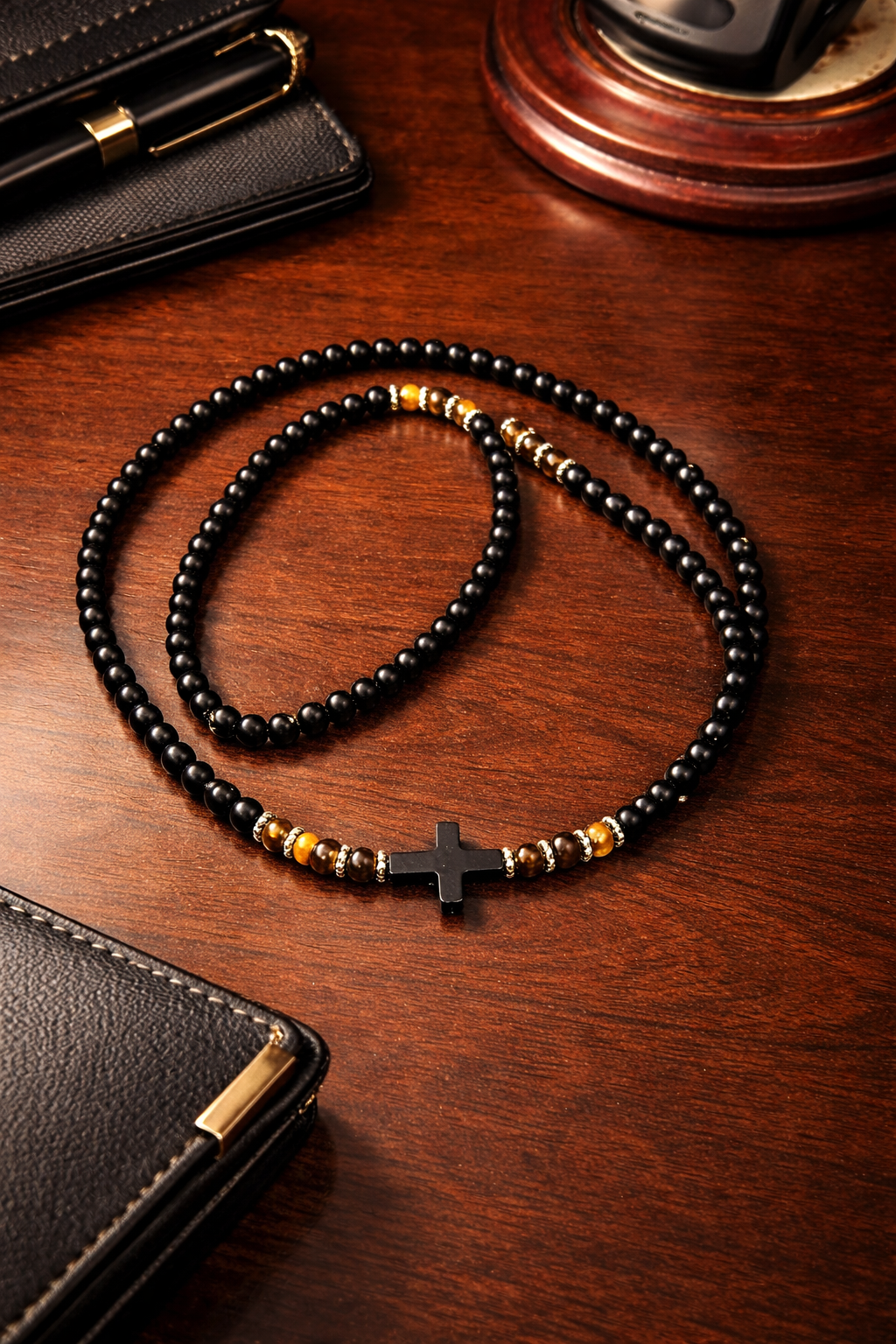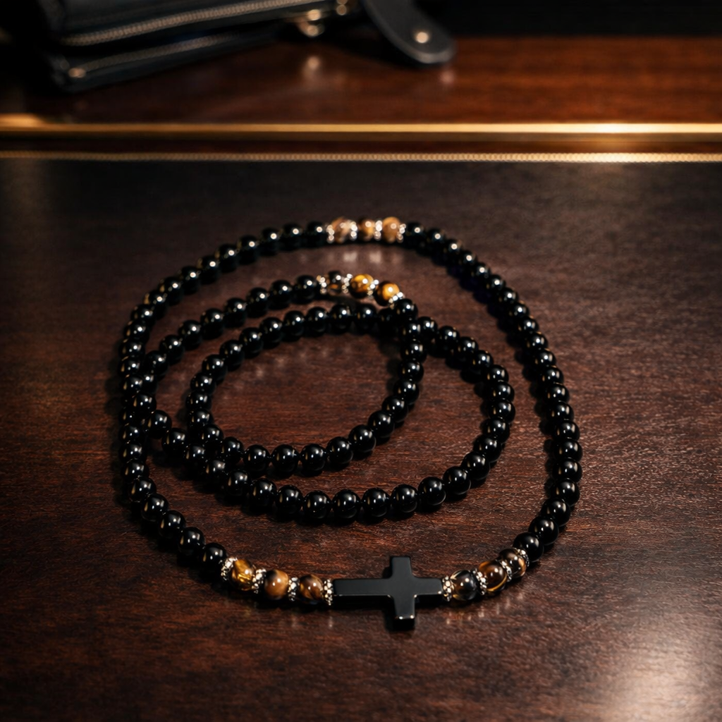 📏 Premium handmade necklace crafted from genuine black onyx beads with a matte black cross centerpiece and natural tiger eye accents. This luxury piece offers a clean, powerful, and timeless look, perfect for everyday wear or special occasions.